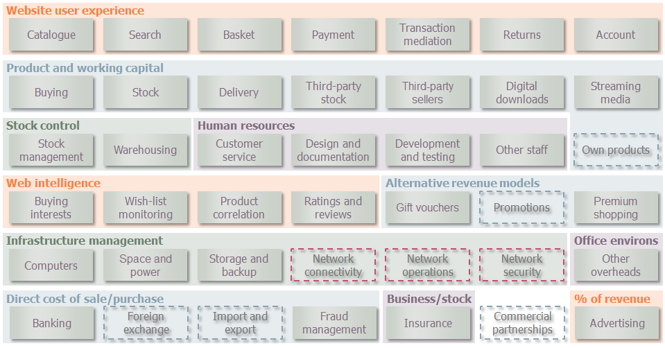The internal commercial model for selling the retailer’s own stock is directly comparable to a conventional retailer. The mark-up must cover the working-capital implications of a given maintained level of stock, in addition to the direct costs of the warehouse space itself and the actual delivery of orders to customers, as well as a stock control system and the staff required to man the warehouse(s).